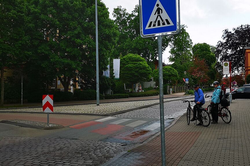 In der Situation auf dem Foto dürfen die Radfahrer*innen die Fahrbahn nicht nur fahrend überqueren, sie haben dabei auch Vorfahrt gegenüber dem Fahrbahnverkehr. Das ist bei Fahrbahnquerungen generell nicht so. Hier ergibt es sich aber aus dem Zeichen „Vorfahrt gewähren“, das vor der Querungsstelle aufgestellt ist. Normalerweise gehört dazu für den bevorrechtigten Verkehr ein positives Vorfahrtszeichen, auf das man hier anscheinend verzichtet hat.